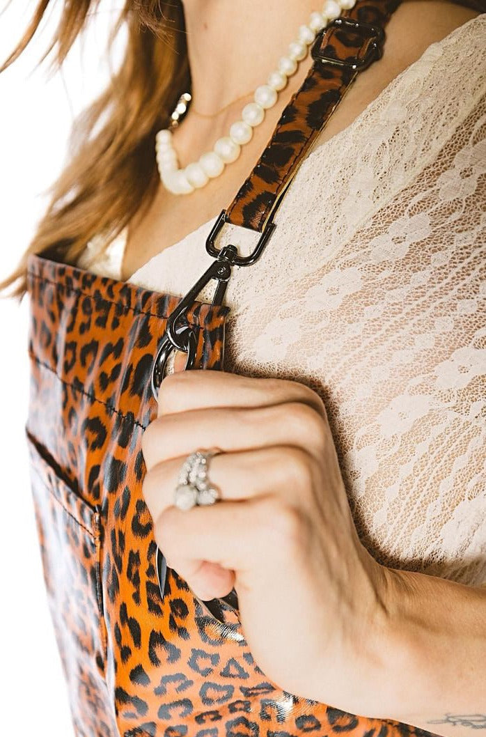 Made from durable and lightweight leopard print vegan leather, it features decorative pearlesque beads with silver chain embellishment and slit up the leg are for added flair. The apron is comfortable to wear with easy waist side ties and does not restrict your movement. It is designed to fit snugly around your waist and features adjustable buckle strap for a customizable fit.