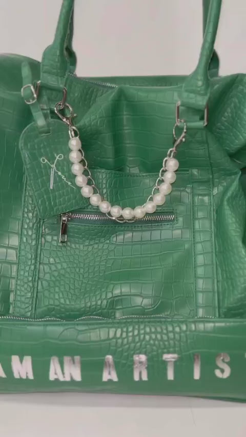 Built to carry your art gear wherever you may venture, Pablo lends modern appeal to the classic trunk bag style. The tote bag is skillfully crafted from high quality smooth and shiny black vegan leather in crocodile print with polyester lining, easy to wipe clean. Stunning embossed silver text reads “I Am An Artist,” solid silver-toned hardware, decorative pearlesque beads with silver chain and scissor luggage sleeve. You will LOVE this unique, distinctive and artistic bag! With handle and adjustable shoulder straps you can use it as a handbag or a shoulder bag.